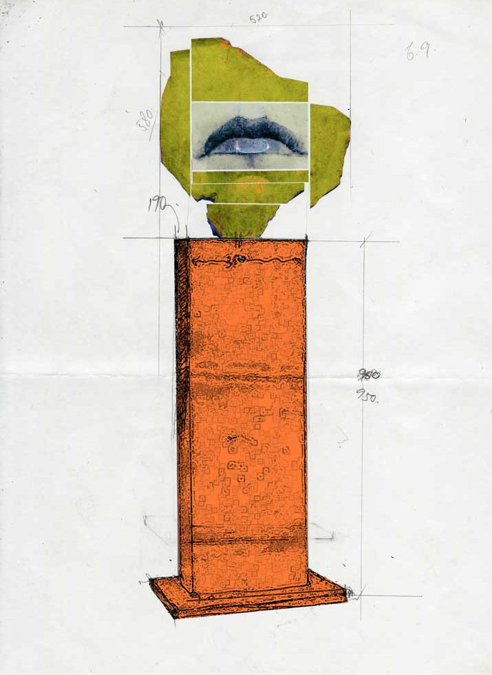 "Mouth Piece" deconstructs the act of communication through an oversized, fragmented pair of lips. Exposing its cuts and seams, the sculpture reveals the tension between expression and vulnerability, highlighting the fragility and power of language. Elevated on a tall metal column, it invites viewers to reflect on how words and meanings are constructed, broken, and reassembled.